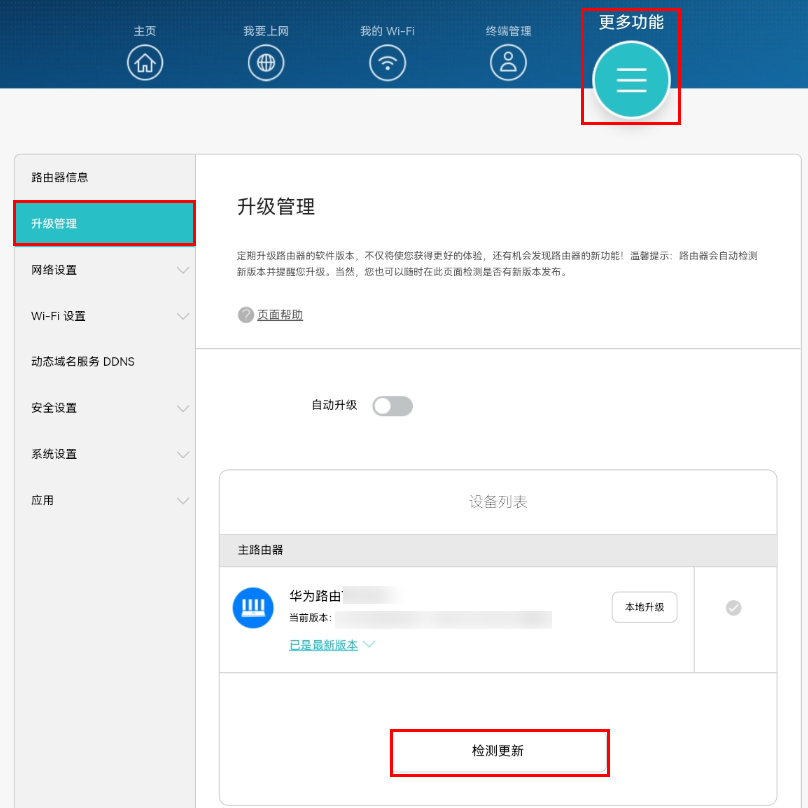3. 点击更多功能 > 升级管理 > 检测更新,检测路由器是否有新版本发布。若有新的软件版本发布,点击立即升级(对于套装路由,勾选需要升级的路由器后,点击一键升级)即可在线完成升级。