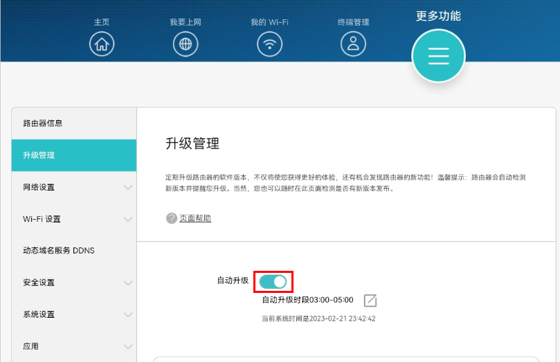 如需开启自动升级,请在升级管理页面,点击右上角 ,打开自动升级开关,设置自动升级时间段,点击 保存,即可开启软件版本自动升级。路由器将会在您设定的时间段自动检测并升级到最新软件版本。