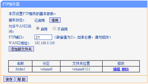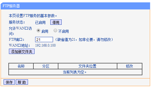 页面回到FTP服务器界面,服务状态点击启用,允许WAN口访问选择启用,点击保存,如下图: