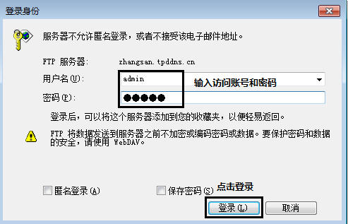 根据以上设置,外网用户在资源管理中输入域名地址或WAN口的IP地址即可访问到存储设备的共享文件,访问形式为:ftp://域名或ftp://WAN口的IP地址,输入访问账号和密码,即可访问到共享文件。