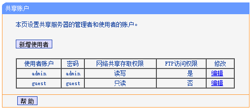 系统默认有admin和guest账户,其中admin可以访问FTP服务器,guest账户无法访问,点击编辑可以修改访问权限。