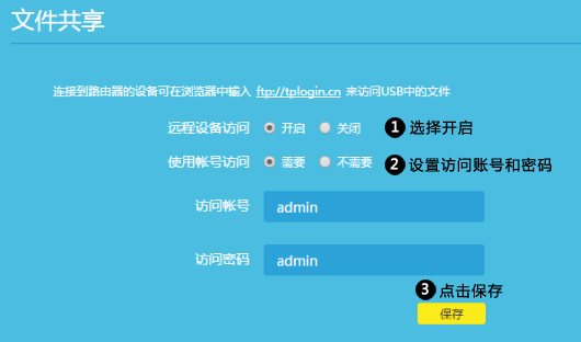 在文件共享界面,远程设备访问选择开启。如果设置账号密码(账号密码是自定义设置的),则终端需要输入账号密码才能访问共享文件。请根据实际需要设置,点击保存,如下图: