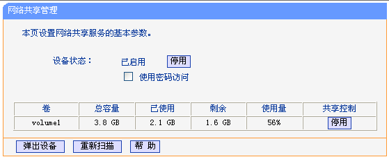 将移动存储设备盘插入路由器的USB接口,且确保路由器上对应的USB指示灯亮,说明存储设备连接正确,此时登录路由器管理界面,在路由设置>文件共享,可以显示连接的存储设备,如下图: