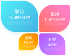 点击花瓣区域,可以看到儿童上网设备昨日、今日、过去七天的使用时长,还可看到儿童上网设备在学习、视频、社交、游戏等各分类的上网时长统计。