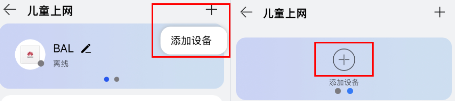 • 部分路由器可以点击儿童上网页面右上角“+”号 > 添加设备,在设备列表中添加新设备;也可以滑动页面至最右边,点击“+”号添加设备。