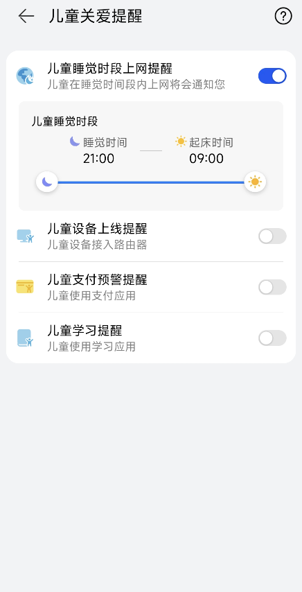 o 儿童睡觉时段(睡觉时间及起床时间)可进行设置;睡觉时段上网提醒每晚推送一次。