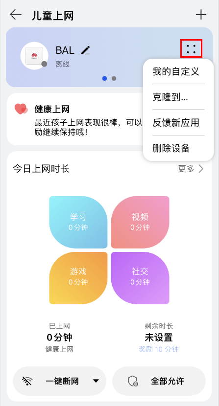 • 部分路由器在儿童上网页面设备名称旁,点击 > 删除设备即可。