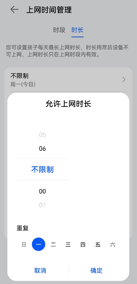 • 上网时长设置(上网时长仅在上网时段内有效):切换到时长,设置好时间周期和上网时长后,点击确定。
