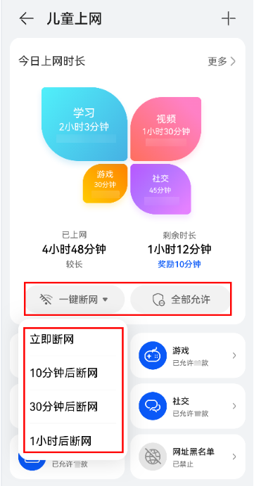 • 一键断网:支持对儿童上网设备设置:立即断网、10 分钟后断网、30 分钟之后断网、1 小时后断网,部分路由器还可以自定义断网时间。点击一键断网并在下拉选项框中设置即可。
