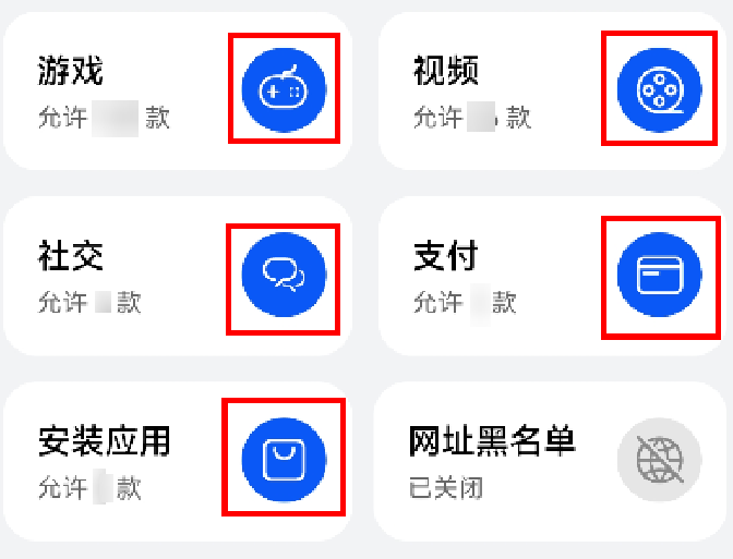 • 点击相应图标可以打开或关闭游戏/视频/社交/支付/安装应用功能,关闭后,对应应用列表里的所有应用都不能连接网络。
