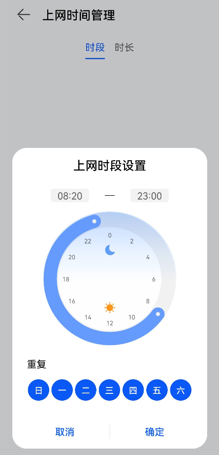 添加时段:点击添加时段,滑动时间轮设置好上网时段(只能设置当天内时段,即,结束时段最晚为当天 24:00)后,点击确定,即设置为仅该时段可以上网。您可根据实际需求,设置多个上网时段。