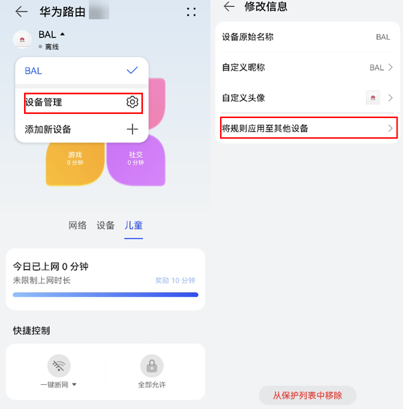 • 部分路由器可以点击设备旁的按钮,点击设备管理,选择要删除的设备,点击从保护列表中移除。