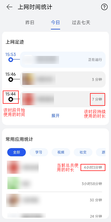 界面任意位置,在新界面将展现该设备上应用的上网足迹,包括该应用在某个时段开始使用的的时间,该时段持续使用的时长,以及当前总共使用的时长。