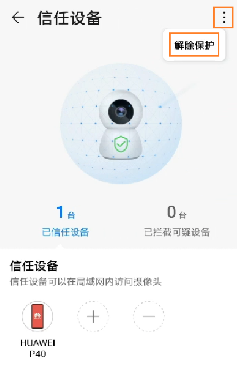 6. 若要对摄像头解除保护:在信任设备页面,点击右上角,选择解除保护。