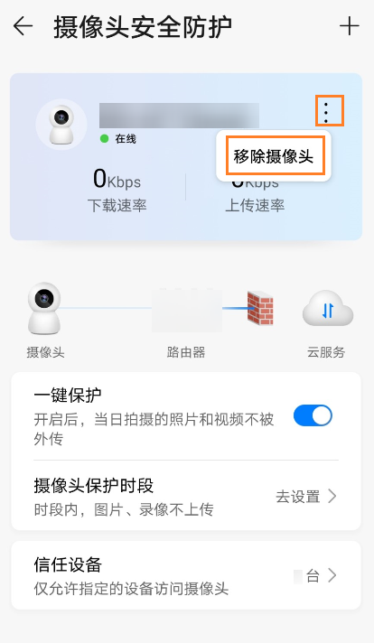 3. 在该摄像头保护界面,可以为该摄像头设置一键保护、保护时段以及为该摄像头添加受信任的设备。