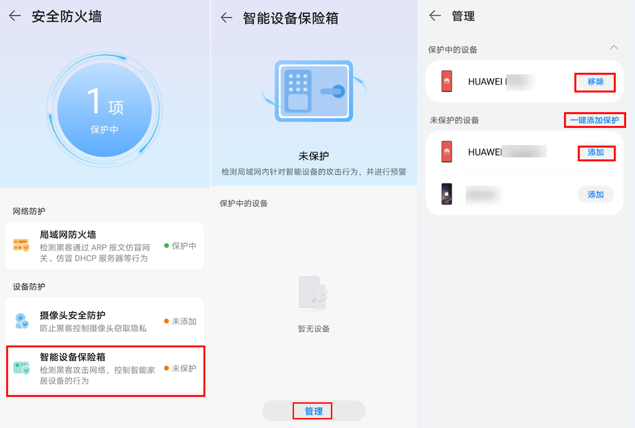 智能家居设备(华为智选类单品)连接路由器 Wi-Fi 后,默认在保险箱中,无需手动添加。若您将智能家居设备移出保险箱后,重启路由器,智能家居设备会自动恢复加入到智能设备保险箱中。