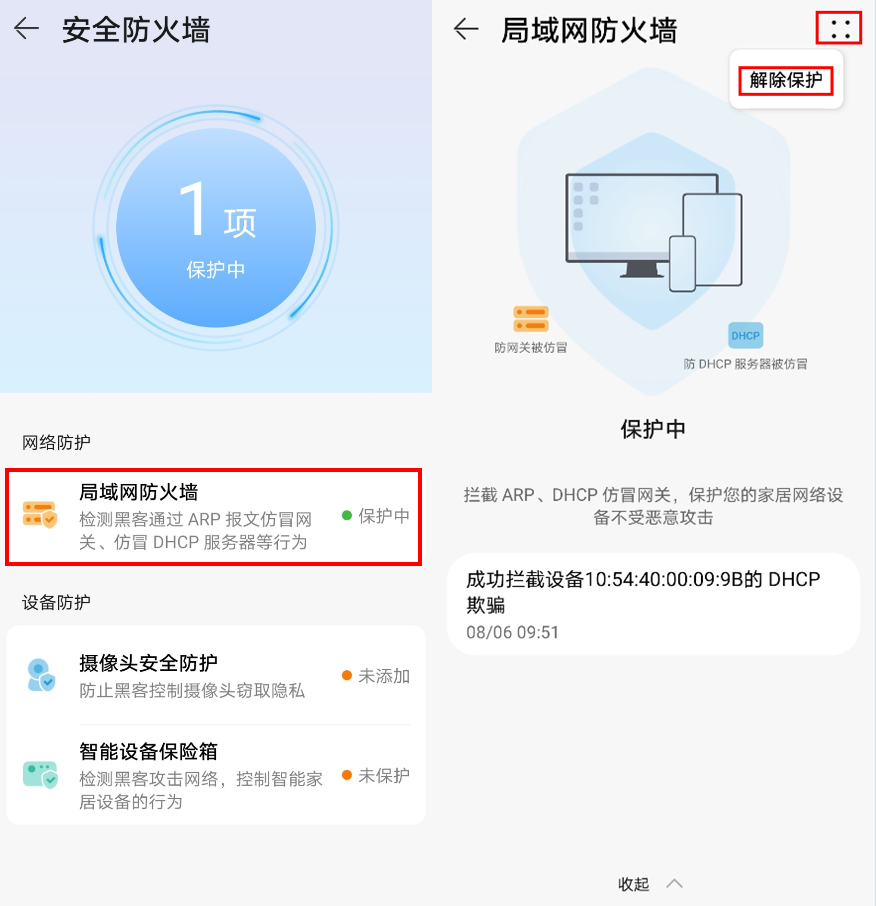 局域网防火墙,可以拦截 ARP、DHCP 仿冒网关,保护您的家居网络设备不受恶意攻击。