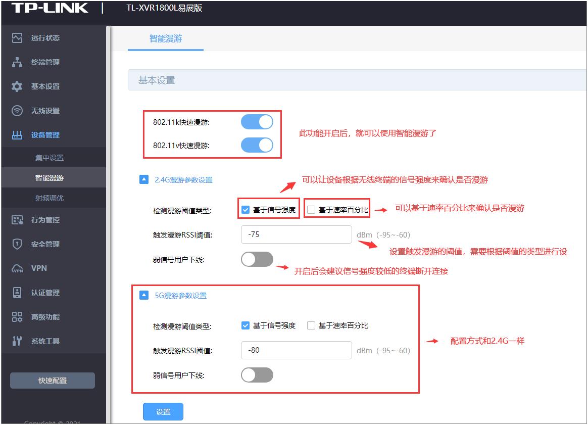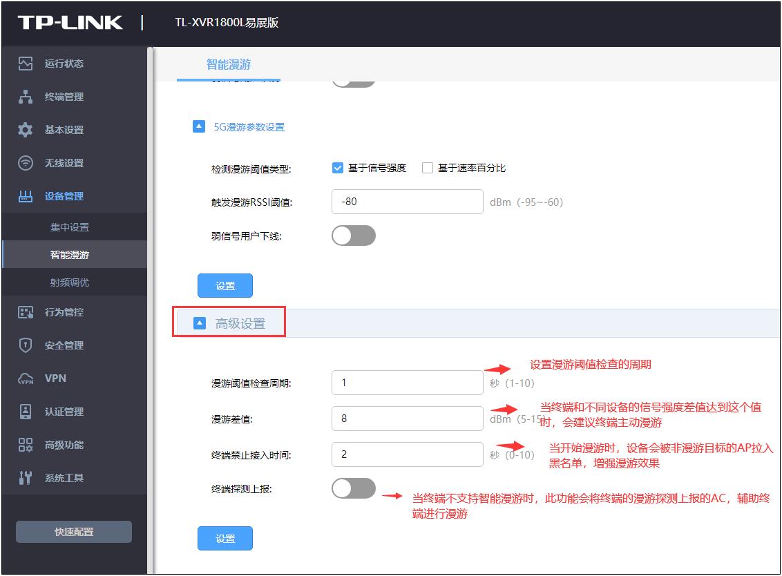 点击【设备管理->智能漫游】,开启802.11kv智能漫游,并设置相应的漫游阈值,建议使用默认参数,如下图: