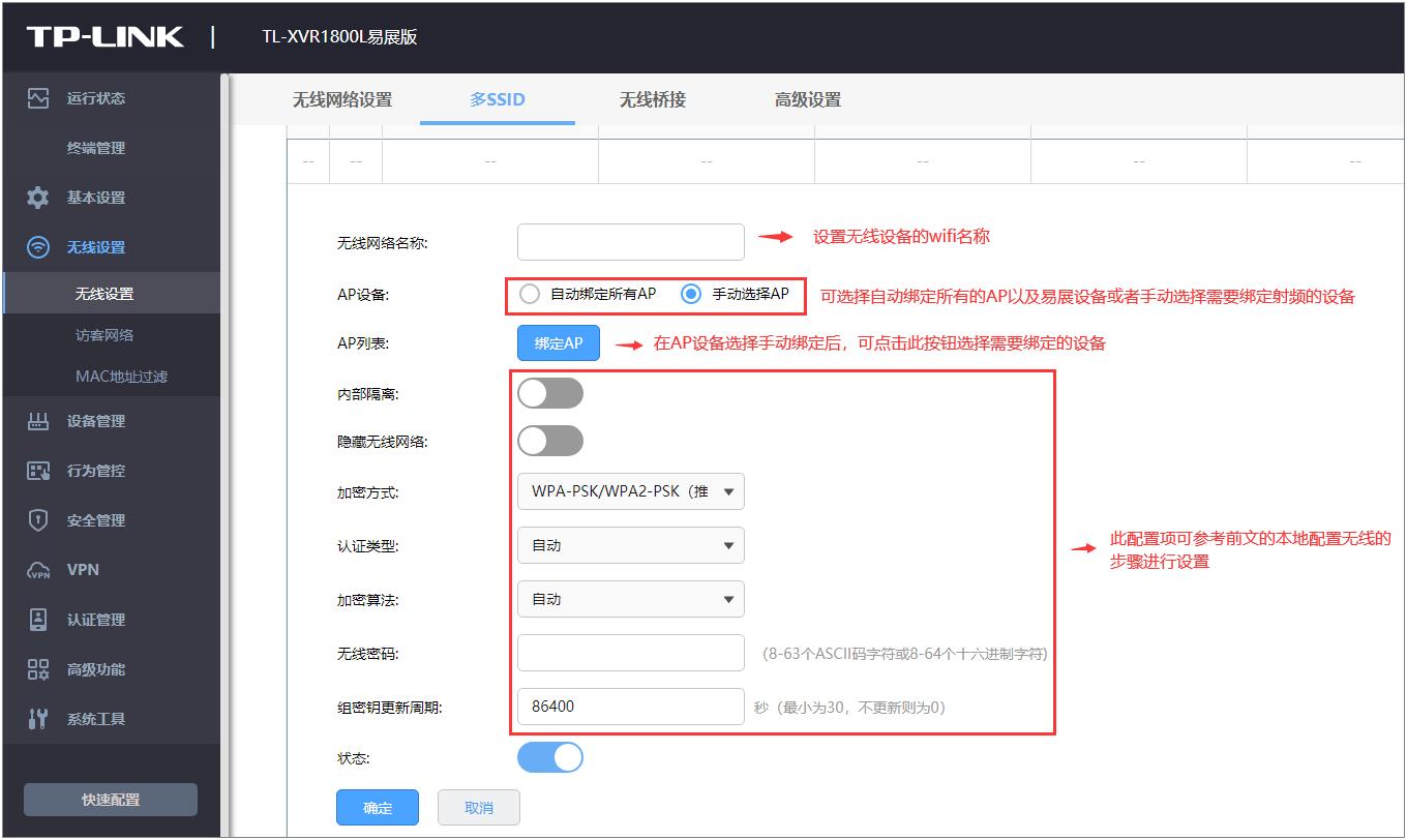 对于TL-XVR1800L易展版的无线网络配置主要分为两个部分,一个是设备自身的无线网络配置和其他设备的无线网络配置(当路由器管理其他设备时),另一个是无线参数的优化和功能的设置。