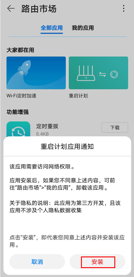 4. 在全部应用列表中找到重启计划,点击下载 > 安装。