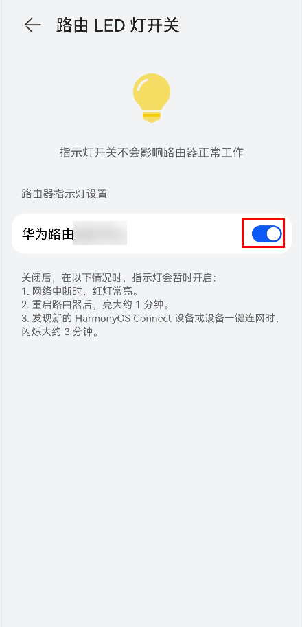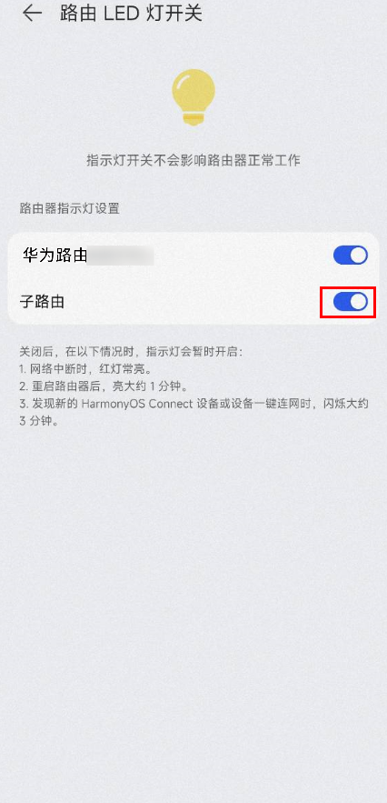 如您觉得华为路由器的 LED 指示灯有些亮,可通过智慧生活 App 来关闭机身上的 LED 指示灯,让睡眠更安心。