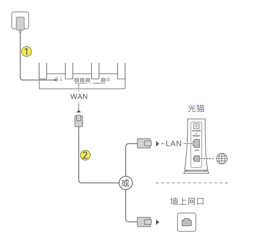 2. 用网线将路由器的WAN口连接到上行网络(如宽带猫/光猫的LAN口、入户网口等)。