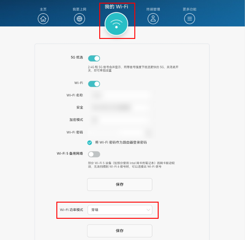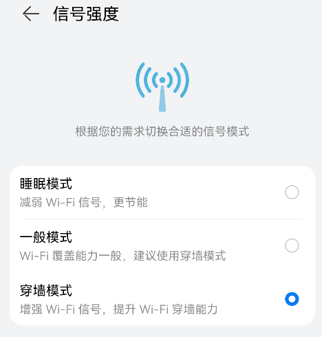 您可以根据您家里的实际网络环境调整功率模式,若对 Wi-Fi 信号强度要求较高,建议选择穿墙模式。