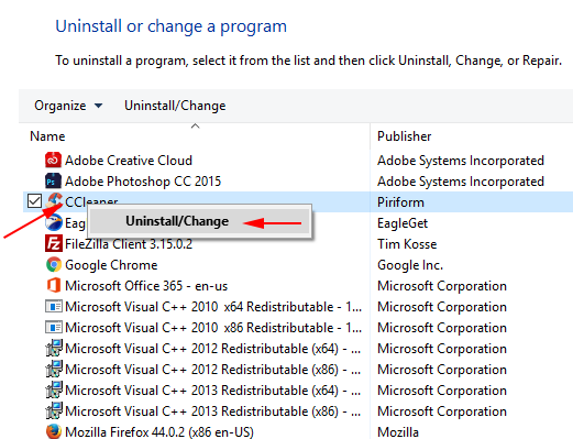 • 双击位于按字母顺序排列的程序列表中的 Ccleaner,然后选择 – 卸载/更改。