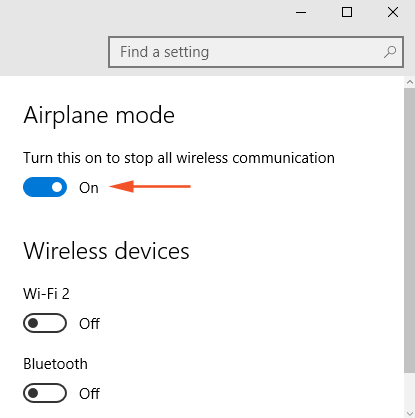 • 看看对面,你可以看到一个标题“飞行模式”,并将“打开此按钮以停止所有无线通信”的开关切换为“打开”。