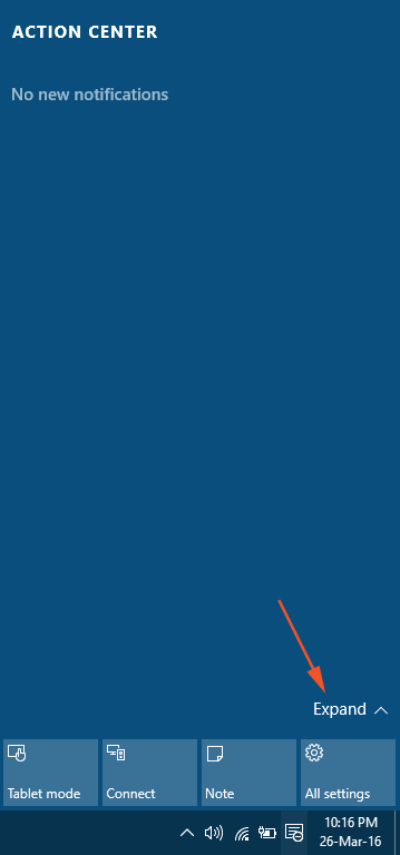 • 如果您在出现的“操作中心”中看不到所有功能的块,请单击“展开”,该功能的侧面带有向上箭头。