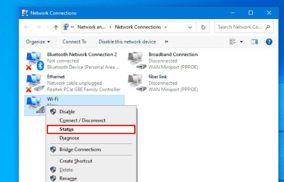 5. 在出现的窗口中,右键单击您的 Wi-Fi 适配器,然后选择 – 状态.