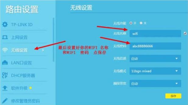 3、在无线页面,输入新的无线网络名称和新的无线WIFI密码,然后点击“保存”(见图5 )。