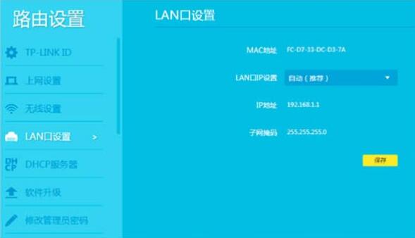 2.成功登录路由器的管理页面后,点击路由设置下面的“LAN口设置”菜单,LAN口IP设置默认为 自动(推荐)。