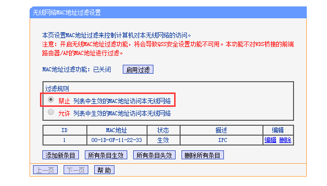 解决方法:开启MAC地址过滤或者设置黑名单会导致该MAC地址无法访问本无线网络,可以检查MAC地址过滤并且查看IPC MAC是否存在于无法上网的列表中,如果有则删除条目。