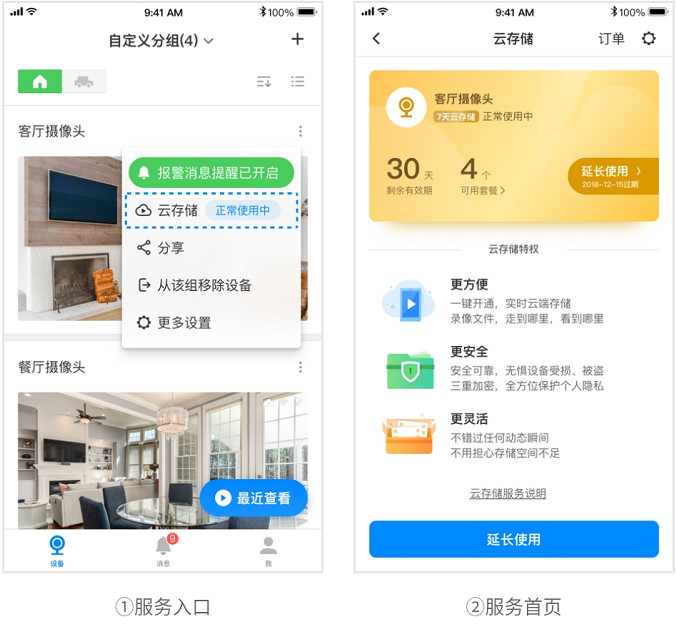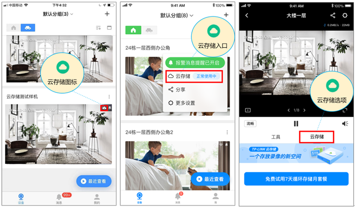 云存储的使用需要APP和设备端同时支持,请将手机安防APP(更新到2.8及以上版本)登录账号,在确保设备固件已更新至最新的情况下,有三种方式可以确定:
