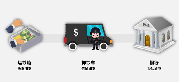如果我们将视频数据理解为钞票,那么,运钞车运输钞票,钞票(视频录像)在运输前需要装入运钞箱(数据加密),通过运钞车和运钞员(传输加密)进行运输至银行(云服务器端),存储在银行的保险柜中(存储加密),从而实现视频的三重加密。