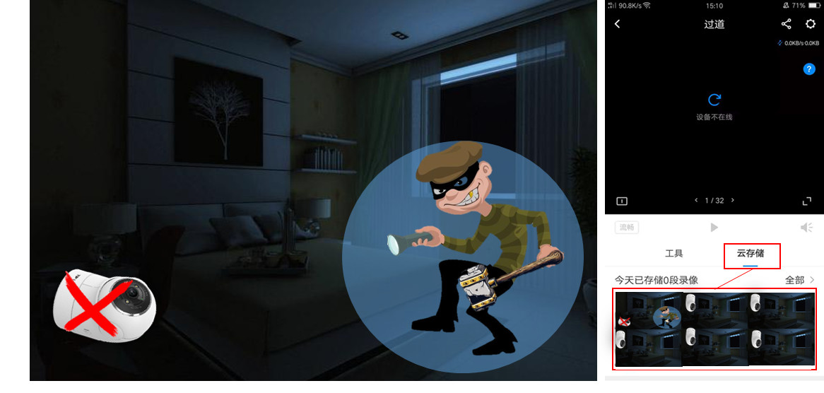 开通云存储后,移动画面的录像会实时上传云端,即使遇到摄像机被损坏、被盗、SD卡等存储介质损坏等异常情况,也不会影响历史录像的安全,甚至可以帮你记录下设备受损或被盗的最后瞬间,让小偷无所遁形。也就是说,SD卡坏了,依旧能实时上传移动录像,小偷打砸、偷盗摄像机的最后一瞬间,也会被上传到云端,手机依旧可以查看到。
