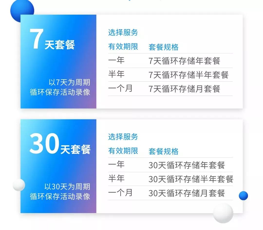 为满足大家对于云存储服务时长和录像时长的不同要求,我司的云存储服务推出6类套餐,可以根据自身实际需求选择对应云存储套餐。