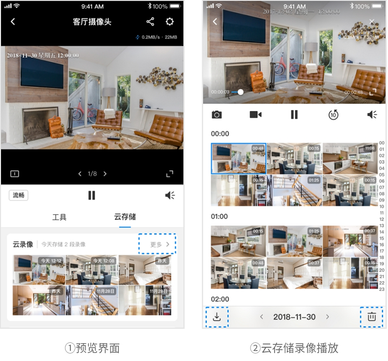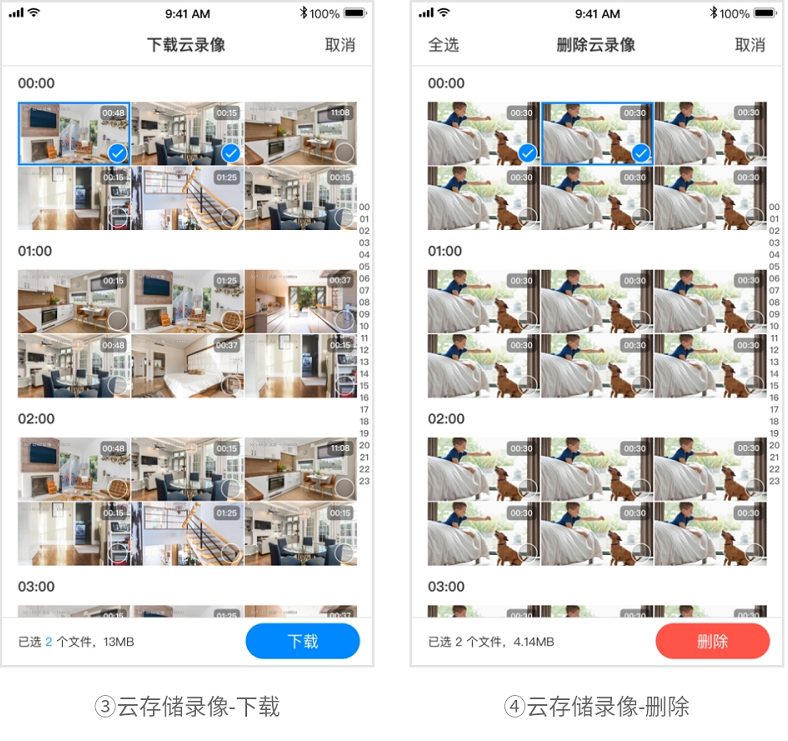 针对云存储录像文件,手机APP/电脑客户端可进行预览、下载和删除等基本功能操作。根据客户实际需求,选择特定时段的录像文件进行查看。