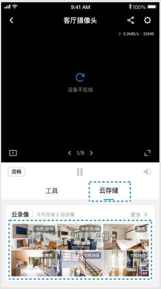 可以查看历史动态录像文件,此外,设备丢失、存储介质损坏等异常情况发生,均不影响历史动态录像查询。但设备离线期间,设备无法将视频上传至云端进行保存。