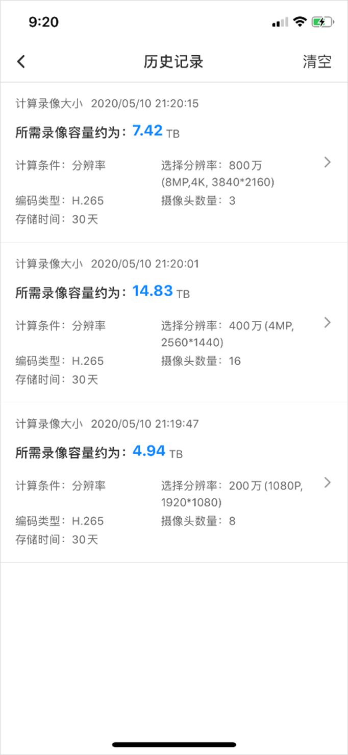 通过历史记录查看所有计算结果 每次计算的结果都会展示在历史记录中,方便对不同类型摄像头的计算结果进行统计。