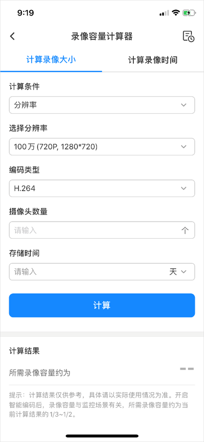 选择计算方式 这里可以根据实际需要选择计算录像大小和计算录像时间两种方式,本案例我们选择计算录像大小。